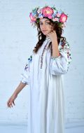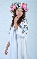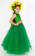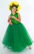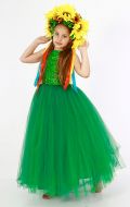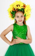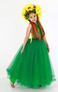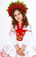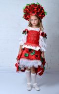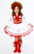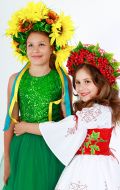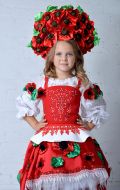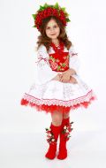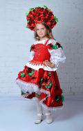 Стилизованный вариант украинского национального костюма, в комплект входит: белая блузка-вышиванка, корсет с декоративными цветами или вышивкой, юбка-плахта, венок и бусы. Так же по желанию можно взять красные тканевые сапожки, которые одеваются на свою обувь (лучше всего подходят туфли или чешки).