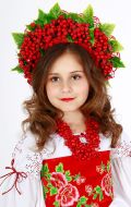 Украинские наряды для девочек такого фасона в костюмерной есть в разных цветах (синяя, зеленая и бордовая жилетка, а так же юбки под цвет). Головным убором кроме венка может служить красная лента с маками, так же есть выбор бус.